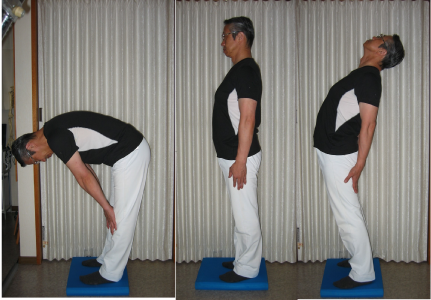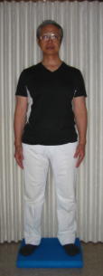 足元のマットが柔らかく反発があるので、身体のふらつきが自覚できます。身体を立て直す反射が遅いと、それだけ身体に力を入れ踏ん張る事で安定を保とうとします。