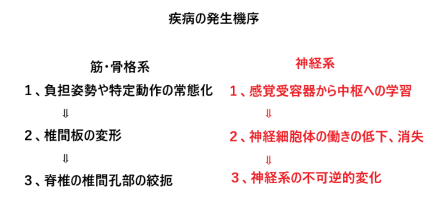 脊髄神経細胞体の消失は上位中枢にも影響し、大脳皮質の可塑的変化を起こし、本来の正しい動作が出来なくなり、慢性痛となります。