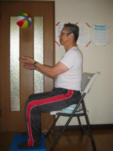 紙風船を打ち上げる遊び。膝の悪い方は座位でもOK!