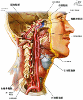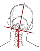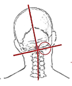 頭部への血液供給経路の重要部位が図の赤丸で示してある後頭骨と頸椎1・2番間部で、総頚動脈から分かれた内頚動脈の流入する部分です。この部位の筋肉組織の硬結・拘縮が、いわゆる骨のズレのよる血管の絞扼→血流障害→脳細胞の代謝不全→脳機能の低下を招くと考察されます。