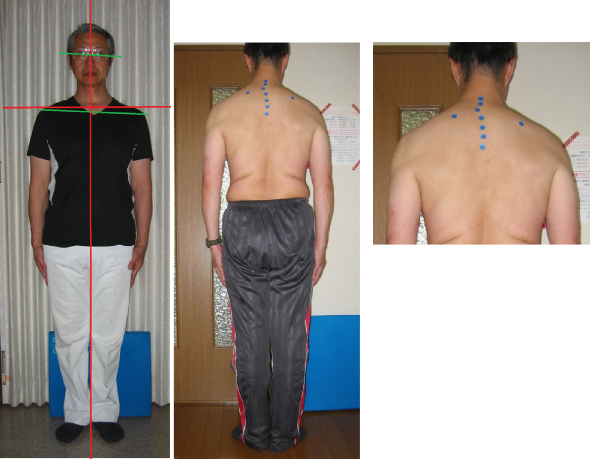 上の左側の写真を見てください。自分としては真っすぐの姿勢感覚ですが、ご覧の通り左肩が下がっています。真ん中の写真を見ていただくと判りますが、胸椎2番部に、いわゆる「ズレ」があるからです。骨の変形はありませんが、この部位の靭帯・筋肉の部分断裂があります。これは、治る事はありません。